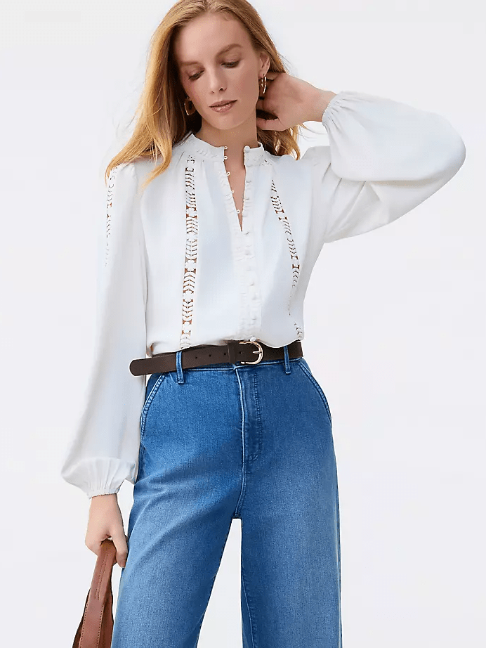 The year is 2009. Remember the days filled with sheer, collared tops? I had several: bright yellow, black with white polka dots, and pink. I loved the femininity of those tops, and love that the feminine details of sheer, lightweight fabrics, pintucks and ruffles are making a comeback. The eyelet bandana is definitely in my cart!