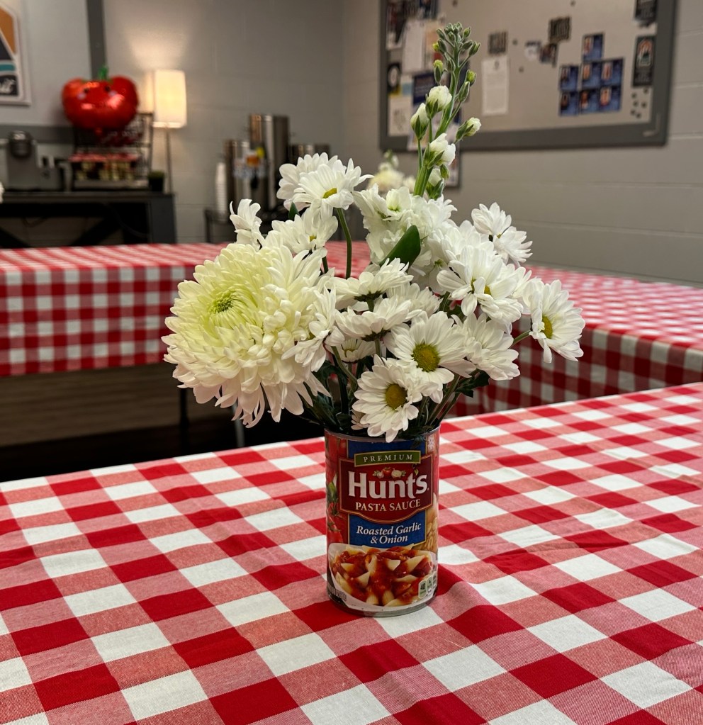 I fished the tomato sauce cans out of the trash for these lovely centerpieces (they were washed, I’m not a barbarian). There were so many comments on how cute these turned out.