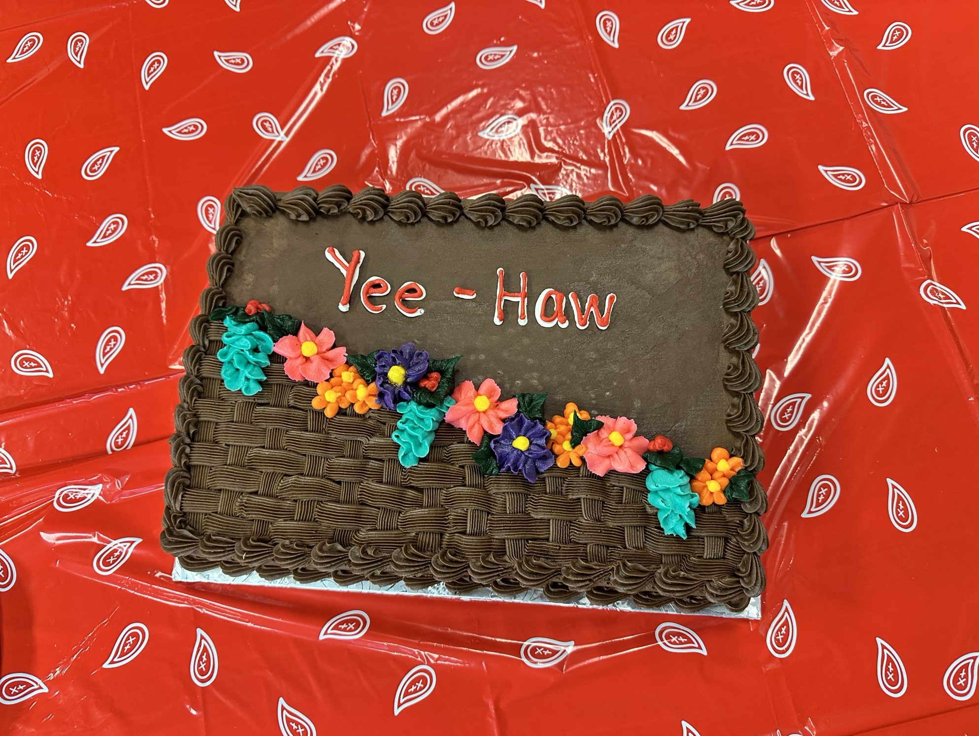 Last minute, I called our local bakery to ask if they had a sheet cake left. When he described the cake, I said, “I’ll take it!” not realizing it was perfect. On brand, couldn’t have been better.