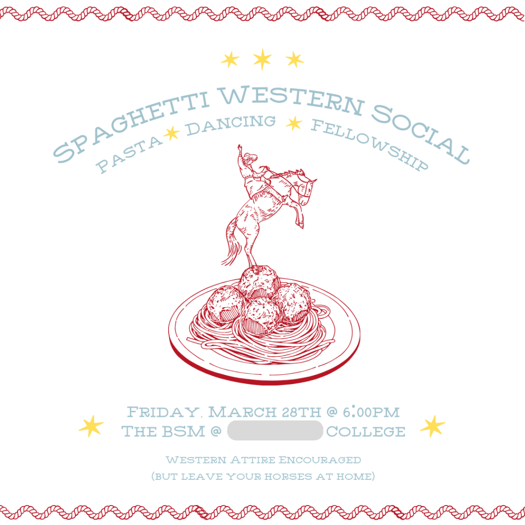 Last spring, as one of our last evens at the BSM (Baptist Student Ministry), we hosted a Spaghetti Western Social! And it is just what it sounds: spaghetti dinner, spaghetti westerns in the background, western attire and two-steppin’. It was a blast!