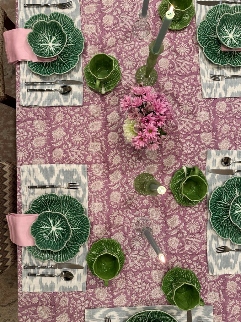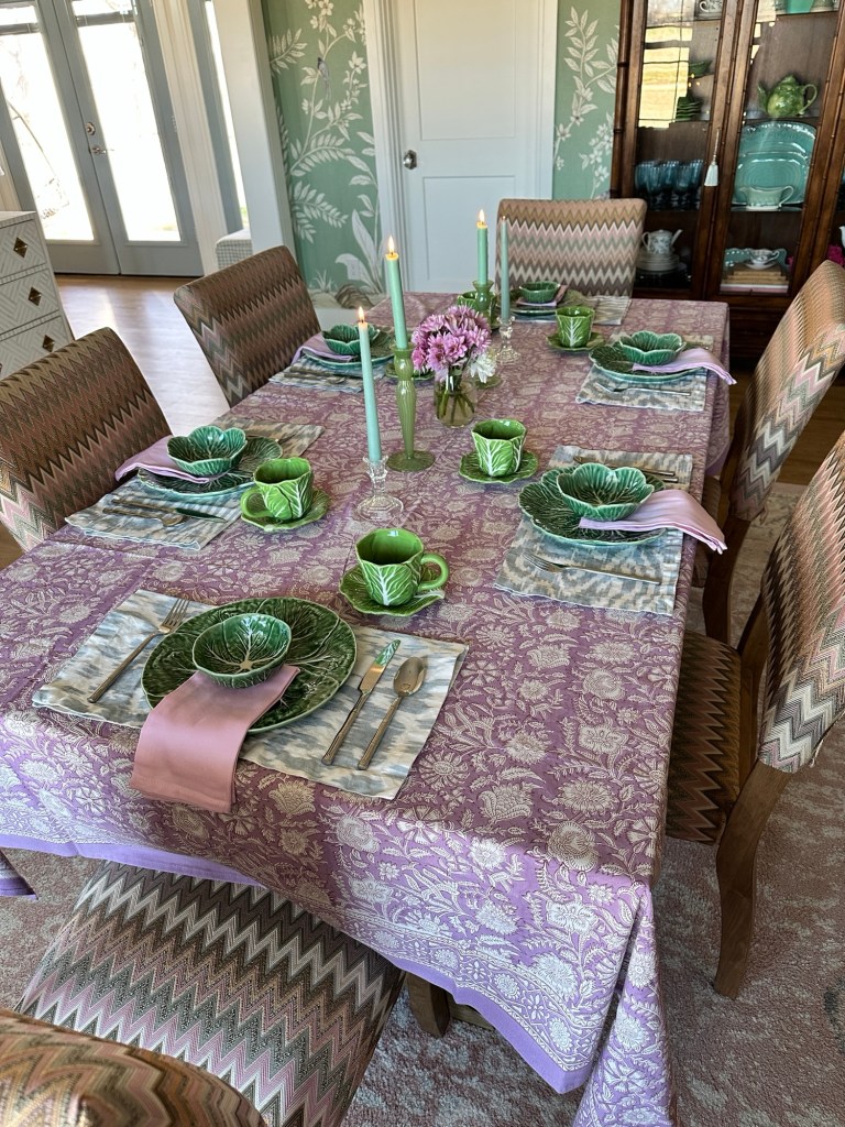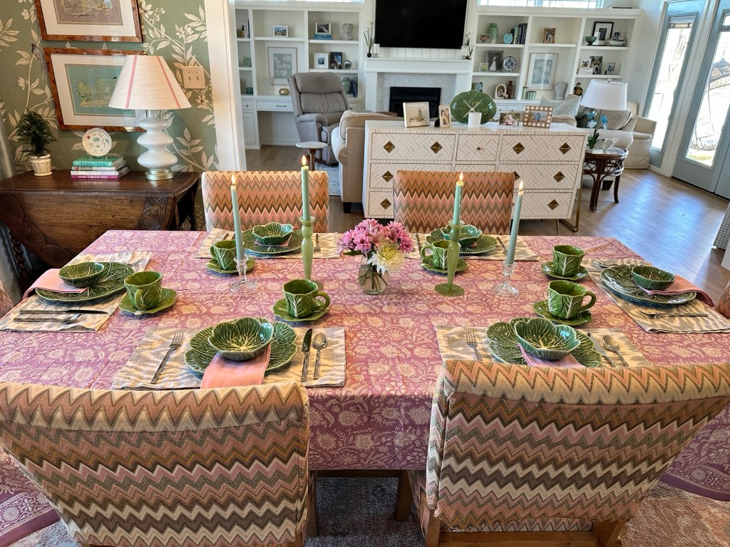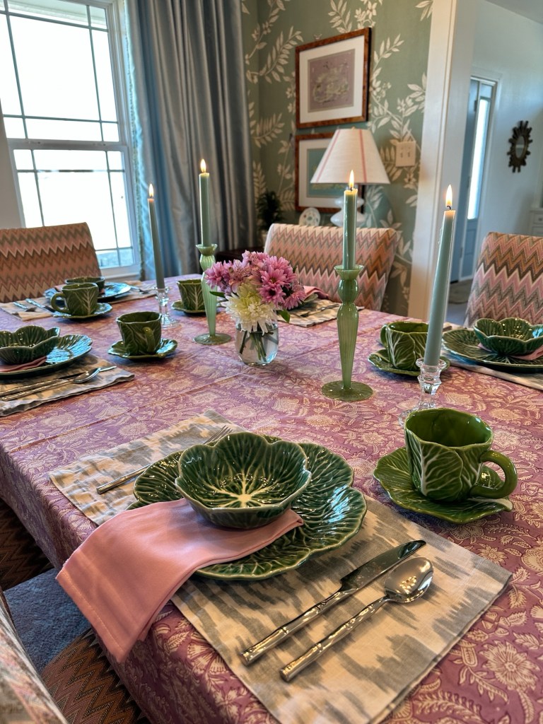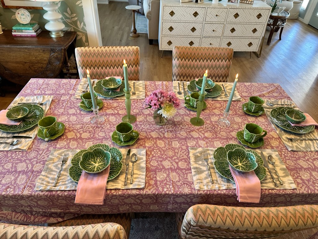 For this set up, I used a mix of cabbageware from Southern Living, Hobby Lobby and Target (last season). My favorite Pottery Barn napkins, which have sadly been discontinued, made some pretty cute placemats! I love mixing patterns, à la Julia Berolzheimer. She is the master of print mixing when it comes to textiles!