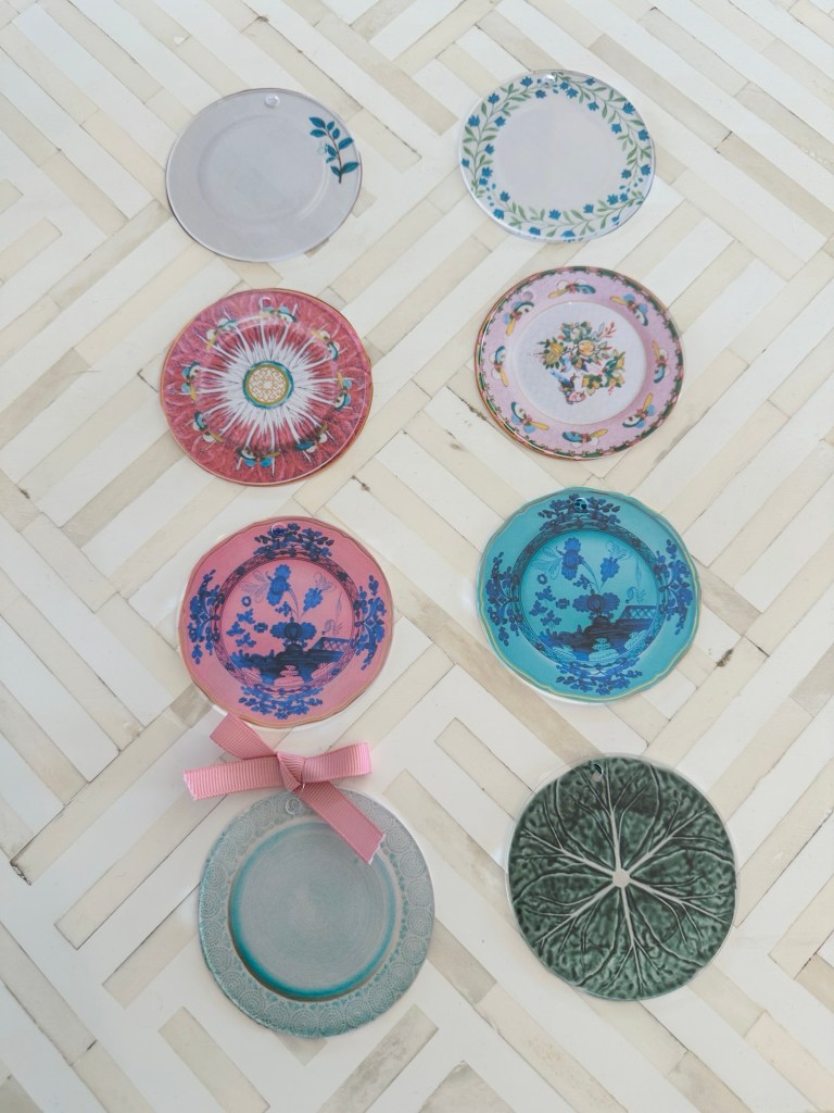 Choose photos of your favorite dishes. I chose options from Anthropologie, Dillard’s, Ginori, Fortnum & Mason, Famille Rose, and Halcyon Days. I selected the images, then pasted them into a Canva document using the template for PLS819. These are the 3″ round labels, but we just want the correct sizing. Remove the background of your image, then resize to just inside the circle for the template. Follow the instructions on the first two sheets to remove the cut lines for printing, otherwise your plates will have a black outline.
