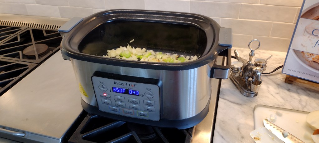 In your multicooker on “saute” or in a skillet over medium heat, warm some olive oil. Add diced onions and celery and cook until transluscent. Add garlic and saute until fragrant.