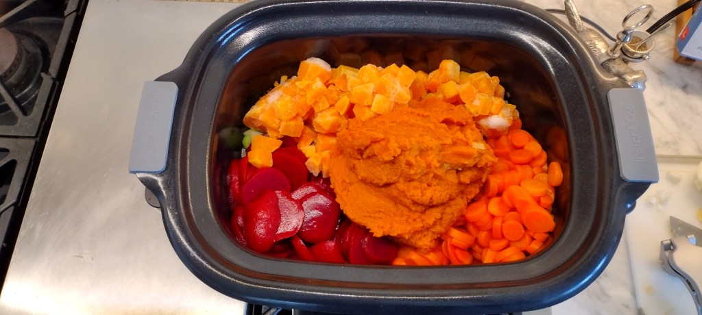 Next, I use the Instant Pot Gem Multicooker (I have now learned it’s been recalled, which is a shame because I love this little appliance!). Using a multicooker has saved me time and dishes by allowing me to sauté the onions, garlic and celery before changing over to the slow cooker mode. Then just add your other ingredients and slow cook on high for 4-6 hours. I love the flavor that happens when you cook this sauce for longer periods of time, and a slow cooker prevents me from burning or splattering my white kitchen with beet juice. If you trust yourself more than I do, feel free to do this traditionally with a stock pan or dutch oven over low heat. I have made this sauce in a shorter amount of time, but the texture is not as smooth.