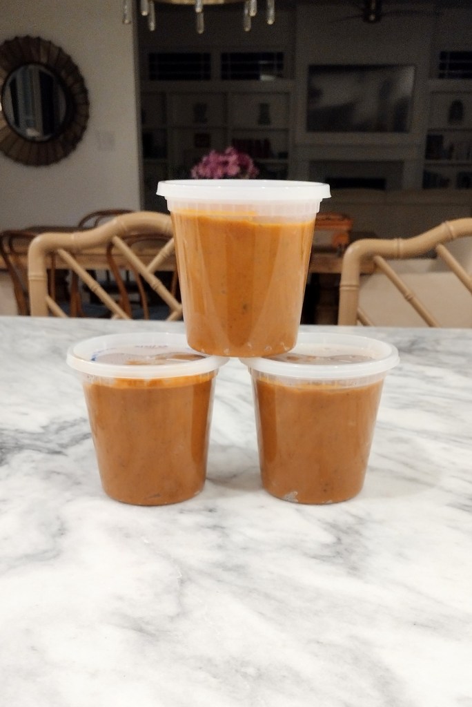 This recipe makes several batches in one sitting. I was able to get four 24oz servings out of it. I then freeze it in a quart bag, leftover jar, or these containers and use within 3 months. You could probably store it longer, but I am not a freezer or canning expert. Three months seemed to be the sweet spot from articles I read. I also love to prep freezer pastas for quick dinners!
