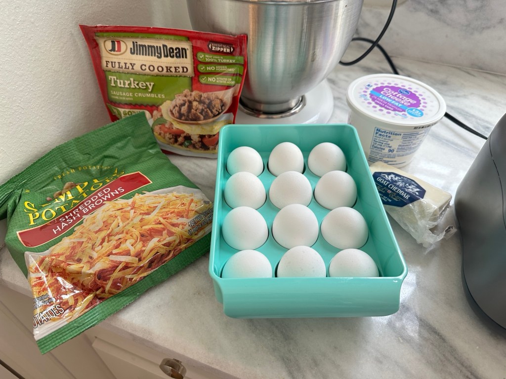 I’ve made these in a variety of flavors, but they always include: 12 eggs, 4oz cheese, and 2/3 cup cottage cheese. The easiest kind have half a package of the Jimmy Dean Turkey Crumbles. And voila, my predictable and fail safe Egg Bites.
