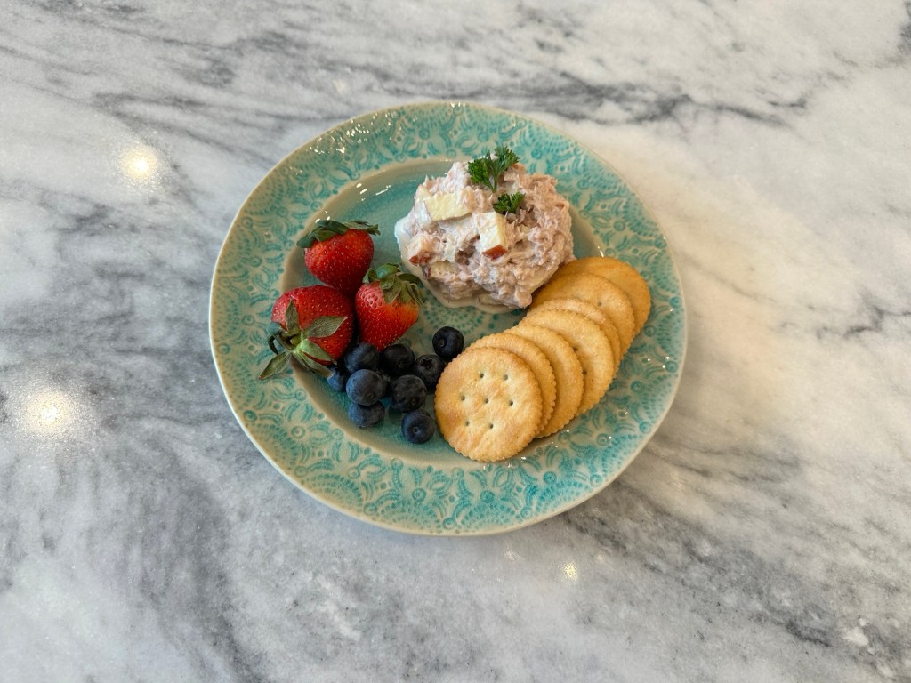 I did omit the cranberries because I’m not a fan of chewy bits and much prefer crunch. I usually double the recipe to take for my two days of work with some Ritz Chips. This is also a pretty wet tuna salad. If you prefer it less “soupy”, reduce the dressing.